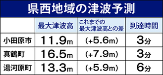 県西地域の津波被害想定は、江戸時代(1703年)に発生した元禄地震と「神縄・国府津-松田断層帯」との連動地震。M8・5規模で、小田原で6・3m、真鶴で8・6mの津波が引き起こされるとしていた。 今回の見直しで、最も大きな被害が出ると想定されたのは、相模トラフ西側で発生したM8・7の地震。真鶴町(真鶴港)が16・5m、湯河原町が13・3m(吉浜)、小田原市が11・9m(国府津)とされ、県が12年に示した津波の大きさを大幅に上回った=上表。