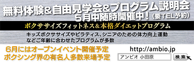 3日(日)から6日(水)まで「ボクササイズフィットネス体験&見学説明会」を開催。オープニングゲストとして世界チャンピオンの山中慎介選手が登場。スタッフによる施設紹介やコンセプトの説明、ロープやミット、なわとび体験もできる。さらに山中チャンプとの体験、アドバイスコーナーも用意されている。各日とも時間は11時〜、15時〜、18時〜(時間外も対応可)。