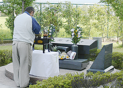 市内成田の(株)GSユアサ小田原事業所は、毎年8月上旬に慰霊祭を行っている。管理職など10人が慰霊碑の前に集まり、順々に手を合わせる=写真。約100人の従業員たちも、空襲を受けた午前8時30分にはそれぞれの持ち場で黙祷。先輩たちの冥福を祈る。