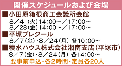 読者をセミナーに無料招待する。参加希望者はオフィスオハナ【電話】0465・49・6119へ申込む。各会場ごとに定員に達し次第締め切り。