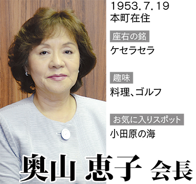 小田原の人ならば一度は耳にしたことがあるだろう「まるだい運輸倉庫」を経営。外に出ることが多く多忙な毎日でも、朝と帰りは必ず会社に戻るようにしている。女社長だけに苦労も多いだろうが「男になったことがないからわからないわ」と笑い飛ばす。来年4月に50周年を迎える同会。「みんなが創り上げてきたものを完成させるのみ」。節目の年を引っ張るのはケセラセラの精神だ。