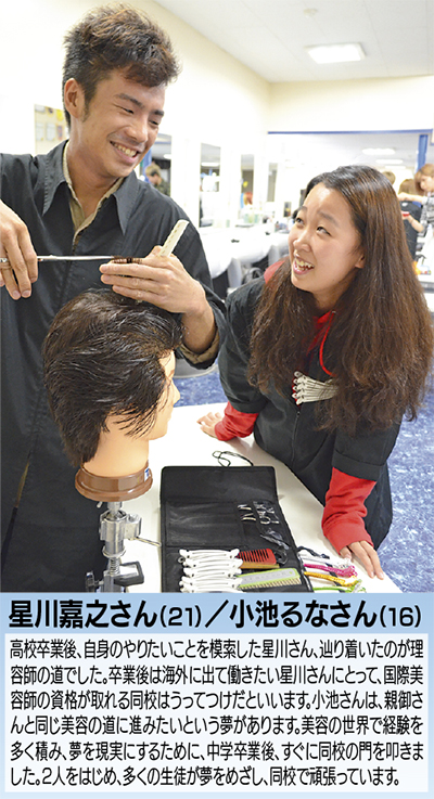 卒業後は母体の「かながわ理容美容協同組合」のサポートもあり、就職率100%。学費は2年間で123万円と一般的な専門学校の約半額。寮へ入り、保護者に頼らずサロンで働きながら通学するコースもある。