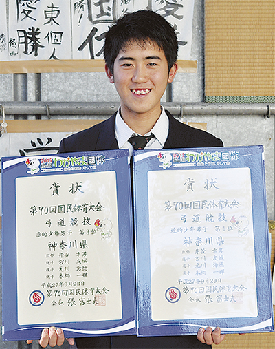 山北高校(三橋史郎校長)弓道部3年の宮川友城君=白山中出身=が9月27日に和歌山県田辺市で行われた国民体育大会弓道競技会に出場し、県代表チームを近的で優勝、遠的で3位入賞に導いた。