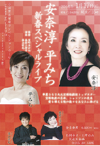 小田原お堀端コンベンションホールで2016年1月17日(日)に開催される「安奈淳・平みち新春スペシャルライブ」のチケットが販売開始された。