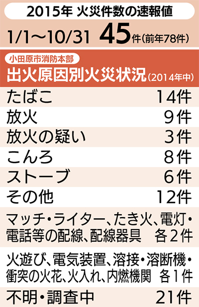 10月8日に広島市で発生した雑居ビルの火災を受け、消防庁は飲食店等が入る建物に対し、立入調査を実施するよう全国の消防署に指示した。小田原市消防本部も10月22日から順次、立入調査を行っている。