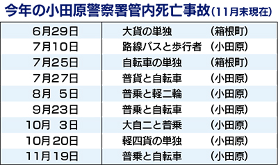 同署管内では死亡事故が増加している。今年1月から11月末までの交通事故死亡者数は9人で、青葉警察署管内と並び県内ワーストとなった(高速隊の12人を除く)。小田原警察署管内が県内ワーストを記録するのは2009年以来。