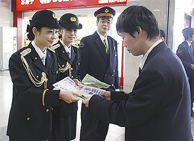 この日はJR東海の小田原駅に務める近藤悠加さんと木村亜沙美さんが「一日女性警察官」となり、同署員と警察官OB会(警親会)と一緒に、新幹線を利用する人たちにチラシとマスクなどを配った。