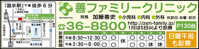 富水のパシオス内に開院して5年目を迎える「善ファミリークリニック」。オールバリアフリーの明るい院内には、充実したキッズルームを完備。子どもが病院嫌いにならないよう配慮がされている。「子どもから大人まで地域に愛されるホームドクター」を掲げる同院。日曜午前にも診療枠を設け、働くお母さんと子ども、家族が一緒に通院することもできる。「自分の生まれ育った地域の方々の為にも、医療の質向上に少しでも貢献したい。経験を活かし、かかりつけ医として地域のお役に立てれば幸いです」と加藤善史院長は話す。