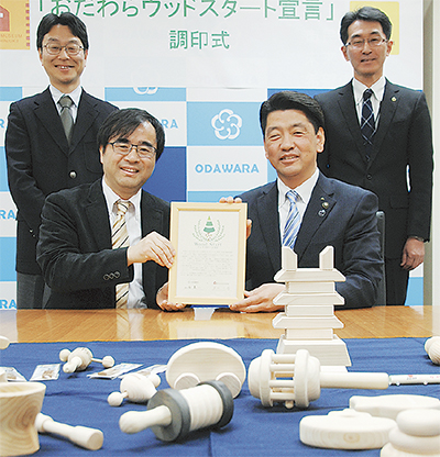 2月9日に開かれた調印式では、加藤憲一市長と多田千尋館長が宣言書にサイン。加藤市長は、市面積の4割を森林が占める小田原で、「定住対策の一環や子育て支援に、地域の資源を取り入れたい」という思いを持っていたとコメント。全国で15番目の登録となった小田原について多田館長は、「木材と工芸の力、両方を合わせ持つ都市は珍しい。多世代が森の恵みを受け、子育てにつながるように」と期待を述べた。