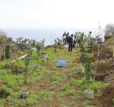 「森」だった約300坪の耕作放棄地を重機で耕し、1月には早川・片浦地域活性化事業の一環で県が推奨する「未病を治す」体験プログラムにも位置付けられ、同プロジェクトについた150万円の補助金も活用し周辺整備を行った。苗木は農家の青木義隆さん(64)が手配し、3月12日には青木さんの指導のもと、1回目の植栽が行われた。この日の参加者は20人以上で、全3回で延べ80人程が参加する見込み。参加者は「ミカンを植えるのがこんなに大変だとは。何の気なしに食べていたが、これからは感謝して食べようと思う。植えた木に実がなるのが楽しみ」と期待を寄せた。今後、毎月1回程度の現地講習で育成。規模は小さいが、ミカン畑復活の兆しが見えた。