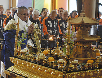 寺院で新たな住職が就任する際に行われる晋山式。当日は江戸消防記念会と市内外のとび職組合らによる木遣りの奉納や、檀家や来賓約250人が般若心経を唱和した。