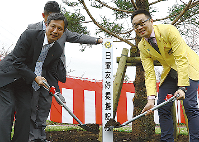また、40周年を記念し、新たにウランバートルRCとの友好を誓い合い、同RCのメルゲン・チョローン会長も来日。式典前に諏訪の原公園で記念植樹セレモニーを行った。メルゲン会長は「モンゴルの諺に人生でやらなければならない3つのことがある。その1つが木を植えること。今日、城北RCの皆さんとそれをでき、大変うれしく思う」と話した。