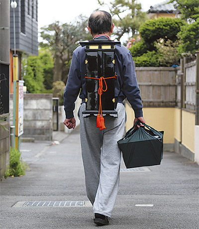 5地区の約800世帯をまわる地蔵尊。蝋燭(ろうそく)や鈴(りん)も備えられた地蔵を何日か自宅に置き、家内安全、無病息災、交通安全を祈願し賽銭をあげる。次の家には前の家の人が背負って届けるのが習わしだ。