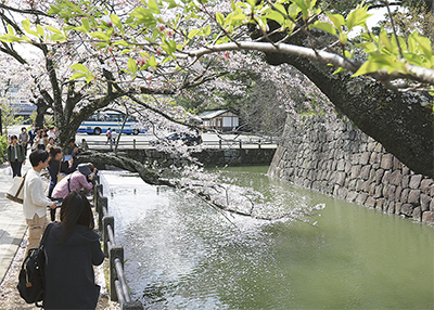 4月6日の好天から一転、7日には桜流しが降った。9日には再び晴れ間が見え、お堀端通りと三の丸小学校に面するお堀の水面には、散ったサクラがゆらゆらと浮き、春風になでられながら「花筏(はないかだ)」を作った。水面近くまで枝を伸ばしたサクラの近くには、花筏と枝を一枚の写真に収めようと、こぞってレンズを向ける人が目立った=写真。