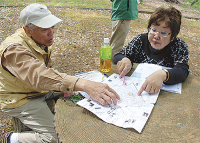 たっぷり3時間歩いて、城山公園で昼食。酒匂の坂田逸司さん(75)は、同協会13年のベテランガイド。この日は勉強のため、一般参加者に混じり同行した。総構に興味があり、自身で1度回ったが、道に迷い断念した経験のある高山千鶴子さん(59)は、予定していた旅行を延期して吉祥寺から参加。昼食時、高山さんは坂田さんのお手製地図に興味津々。ゴール後、しっかりコピーを手に入れた。