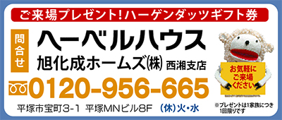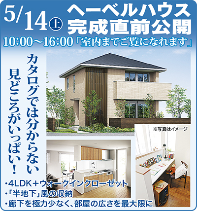 へーベルハウスの旭化成ホームズ(株)では5月14日(土)に完成直前の建物を公開する。予約は不要だが不明な点などは気軽に問合せを。