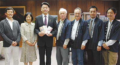 小田原地区木材業協同組合の秋山照輝理事長らと株式会社ラ・ルースの相田秀和社長、デザイナーの伊藤陽子さんが5月2日、小田原市役所を訪れ、加藤憲一市長に寄付金13万円を手渡した。伊藤さんがデザインし、ラ・ルースが生産と販売を担う地域産木材のおもちゃ「かまぼこつみき」の販売額の一部と、木協で扱う木材の売上げの一部を合わせたもの。