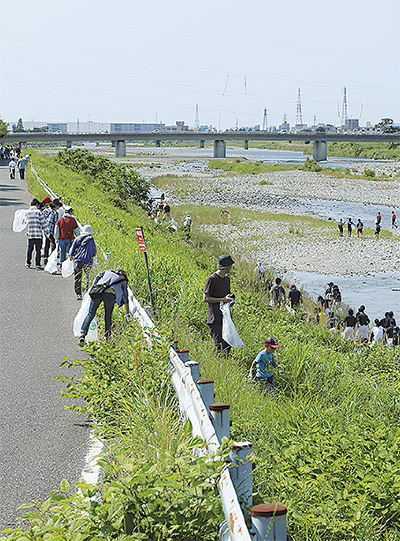 酒匂川河川敷を一斉に清掃する市民活動「クリーンさかわ」が5月22日に実施され、酒匂川沿いの自治会をはじめ企業、ボランティア団体や学生など、5116人が参加した。