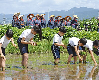 二宮金次郎など郷土文化の学習も兼ねたもので、かつて金次郎が酒匂川の洪水発生後に捨てられていた苗を植えるために耕したという同小近くの「捨苗栽培地跡」で実施。黙々と丁寧に植えつける児童の背後では、同地区で継承されているゆったりとした曲調の栢山田植歌を保存会のメンバーが歌い上げた。
