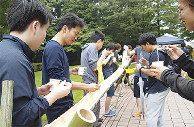 関東学院大学小田原キャンパスで6月29日、学生たちによる流しそうめんが行われた=写真。今年は金沢八景キャンパスの30人ほども小田原を訪れ、約90人がそうめんを頬張った。