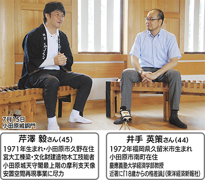 経済学者の井手英策さん(44)と宮大工棟梁の芹澤毅さん(45)が、各々の生業を通して小田原での暮らしを見つめる対談。一つのものごとを究めるには、広い視野で、手腕や方法の選択肢を持つことが求められていると説く4回目。
