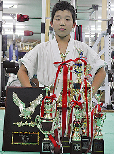 中学生男子軽量級の部を制した皆本君=写真下=は、ここ半年で優勝2回、準優勝4回と絶好調。今大会では、初戦こそ延長戦にまでもつれ込む大接戦を展開するも、僅差で勝利を収め勢いに乗った。その後は、持ち前のスピードと力のある突きで他を圧倒。優勝まで一気にかけ上がった。