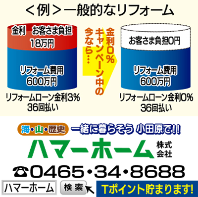 リフォーム資金が気になる人に朗報!地元での施工経験豊富な総合建設業「ハマーホーム(株)」は、リフォーム時の金利0%キャンペーン(5年・最長60回)を展開している。