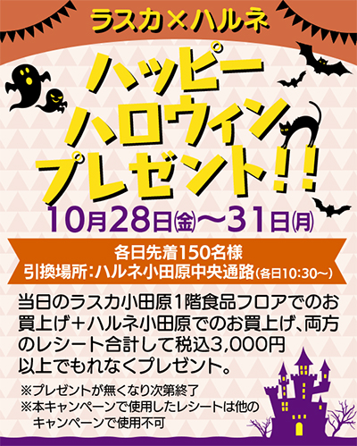本日10月28日(金)から31日(月)は、ラスカ小田原の1階食品フロアとハルネ小田原がコラボし、「ハッピーハロウィンプレゼント」を開催。それぞれで買物して合計3000円以上(税込)であれば、各日先着150人に素敵なプレゼントあり。