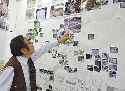 戦国時代、北条氏によって整備されたとされる日本最古の上水道「小田原用水」。現在でも板橋や南町周辺では開渠になっている部分が確認できる。企画展では、資料と現在の写真を落とし込んだ大きな地図を展示。周辺トピックと併せて紹介している=写真。