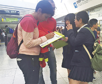 調査は、日本への観光の目的やこのエリアでの行先、滞在日数といった旅行滞在内容など。最初は緊張していた高校生たちだったが、自身の英会話力を試すチャンス、と果敢に挑戦。約1時間の調査でカナダ、オーストラリア、ポーランド、マレーシア、アメリカ、メキシコなど、26人の外国人観光客からアンケートの回答を得た。終了後には「快く対応してもらい、いい経験になりました」と皆、安堵の笑顔を浮かべていた。