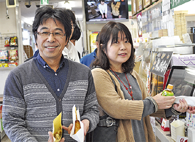 一番乗りとなったのは、綾瀬市の春日克郎さん・明子さん夫婦。この日が明子さんの誕生日で、熱海への旅行の途中、寒いので温まろうと偶然立ち寄ったところ、カマスボーが進呈された。思わぬバースデープレゼントをもらう形となった明子さんは「カマスは普段あまり食べない。淡白な味もチーズがかかっていて美味しい」と喜んだ。