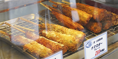 カマスボーはプレーン、カレー、チーズの3種類の味があり、どれも1本280円(税込)。平日50〜60本、土日は200本の売り上げを見込んでいる。