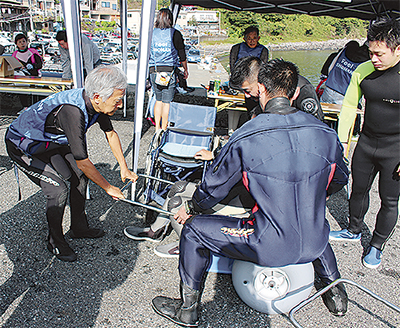 イベントは、江之浦でダイビングショップを経営する野瀬勝利さん(45)の父・秀利さん(65)の時代から続いている。今年は神奈川県が海の魅力を発信するプロジェクト「フィールショウナン」の一環として、障害者や高齢者にもダイビングを楽しんでもらおうと実行委員会を立ち上げ、海業センター(漁協)、江之浦自治会の協力で「バリアフリーダイビングフェスティバル」として開催された。この日は一般のダイバー約200人の他、障害を持つ8人のダイバーが参加、ダイビングを楽しんだ。
