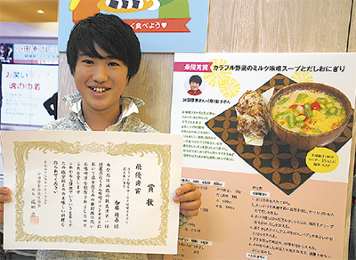 地元のいいみちそを使い、野菜たっぷりで減塩、かつおいしいことを条件に競われたレシピコンテスト。加藤君は母の聖子さんと一緒に考えた、パプリカやアスパラガス、トマトなどを使った「カラフル野菜のミルク味噌スープとだしおにぎり」で、応募総数51作品の頂点に立った。