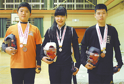 今大会には、世界30カ国から選手が出場。段級位ごとに競技が行われ、基本動作を審査する部門(5〜6級の部)で立木政充君(東富水小6年)が3位、盾も使う盾小太刀(3〜4級の部)で松田嵩大(しゅうと)君(橘中2年)が3位、さらに基本動作の団体戦で立木君、松田君、松田実来さん(山北高1年)のチームが準優勝を収めた。世界最高峰に位置する大会での快挙に、立木君は「ちょっとしたつま先の向きや足幅などにこだわった」とうれしそうだ。
