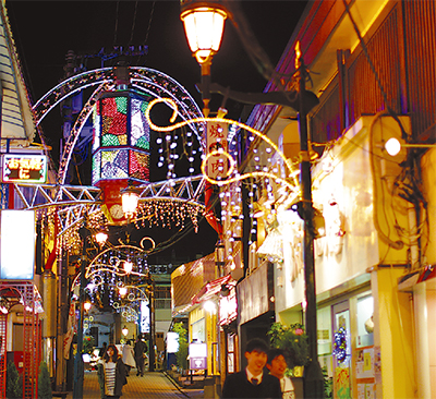 小田原駅東口のおしゃれ横丁商店街のイルミネーションが、生まれ変わった。商店街の中心に位置するドリームタワー(写真中央)の筒状部分の電球を付け替え、12月8日から通行人の目を楽しませている。