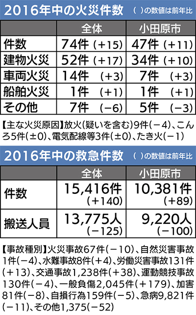 市消防本部が管轄する小田原市、南足柄市、中井町、大井町、松田町、山北町、開成町では、1年間の火災件数が74件。2015年は59件と少なかったものの、16年は例年並みとなった。うち小田原市内は47件で、種別ごとに見ると、住宅火災23件を含む建物火災が34件と最も多かった。市内の火災による負傷者等は、新幹線火災があった前年から4人減って1人、負傷者も25人減って12人だった。