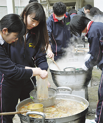 その後、生徒会や各クラスから立候補した実行委員のメンバーらが続々と登校。7時30分頃からは、煮立った4つの大鍋に、野菜や豚肉を順番に投入していく。普段より1時間早い6時過ぎに家を出た青木実玖さん(1年)は、「朝はつらかったけれど、生徒会の先輩たちのために」と話し、柔道部の田澤真央さん(1年)も「指導してくれた3年生に食べてほしい」と味噌で味付けをしていった。