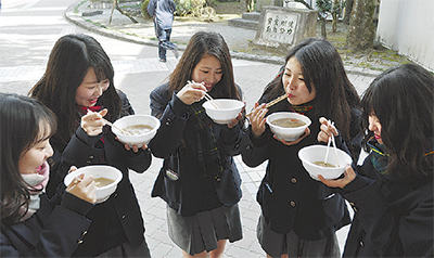 3時間かけて煮込んだ500人分の豚汁は、11時から3年生に振舞い。「野菜が柔らかい」「肉に味がしみておいしい」といった声があがり、先輩から笑顔がこぼれた。高校で柔道に励んだ吉田萌花さん(3年)は「後輩も作ってくれたのですごくおいしい」とおかわりも。大学に進学予定で「将来は警察官になりたい」と決意を語った。
