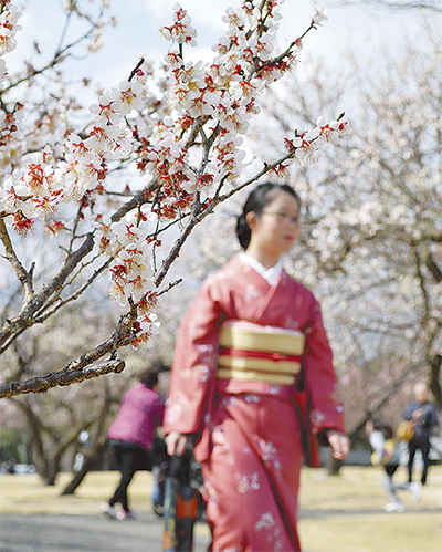 遅咲きの梅が見頃の小田原フラワーガーデンで2月26日、着物を着て梅園を散策するイベントが催された。