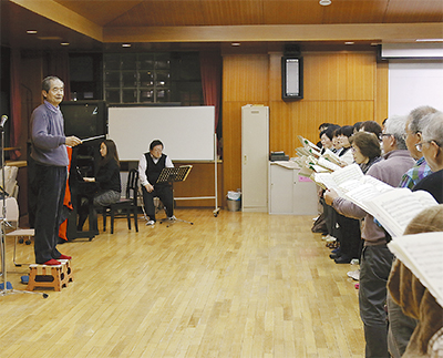 今回の目玉は、『大地讃頌』を含む『土の歌』の作曲者・佐藤眞氏が直々にタクトを振るということ。2月22日、大詰めを迎えた三の丸小学校での合唱団の練習に佐藤氏が訪れ、合唱を指導した。