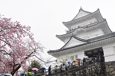 「やっぱりお城には桜が合うわね」。桜が見頃を迎えた4月8日、小田原城天守閣はにぎわいを見せていた。雨が降り続く中、県内外、さらには外国から訪れた人々で登城口には行列もできた。