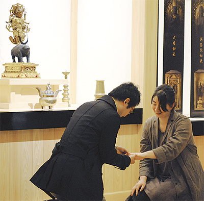 裕之さんは「弓道場で初めて会った時、かわいいなと思った」と緊張した面持ちでプロポーズ。成功すると、摩利支天像の前で指輪をプレゼントした。