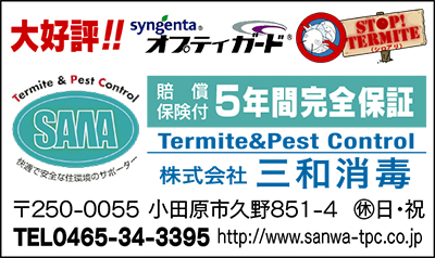 毎年羽アリが出る。最近床がブカブカする。こんな症状はないだろうか。ひょっとして、シロアリという住まいの病かも?木材の繊維質を分解して土に返すシロアリ。見えないところで私たちの大切な住まいが蝕まれ、何時しか倒壊なんて事に…。そんな不安を解消してくれるのが床下のスペシャリスト(株)三和消毒だ。しろあり防除士の有資格者による豊富な経験と熟練の技術力だから任せられる。また、安全性の高い認定薬剤を使用するこだわりと施工後5年間の保証付きだ。