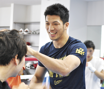 「変な形で有名になっております村田です」。世界戦での判定負けを挙げ、集まった会員らに爽やかな笑顔を振りまいたのは、ボクシングロンドンオリンピック金メダリストで、先日WBA世界ミドル級王者決定戦に挑んだ村田諒太選手(帝拳ジム所属)だ。ボクシング&フィットネスジムアンビオ(栄町・松田直樹会長)を6月11日に訪問。シャドウや豪快なミット打ちなどを披露した。村田選手は松田会長の後輩。松田会長の一声で今回の”電撃訪問”が実現した。
