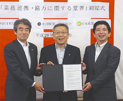 小田原第一信用組合(椎野武理事長)、(株)日本政策金融公庫小田原支店(久保幸一支店長)、神奈川県信用保証協会(松藤静明会長)の3者は6月13日、地域経済の活性化促進を目的に業務提携・強力に関する覚書を締結した=写真。