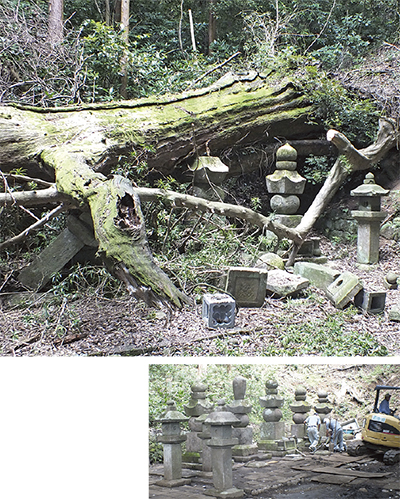 2014年7月、同寺は天候災害により巨木が倒れ、春日の局と稲葉一族の墓所が倒壊。甚大な被害を受けた。住職の武内徳昭さんは「巨木の撤去や墓石の積み直しには、作業時間や費用など、想定以上の課題があった」と話す。約3年の間、手つかずの状態が続いたが昨年7月、市民ボランティアや市文化財課の協力を得て修復作業を開始。8月末、元の姿を取り戻した。「ご心配をお掛けしておりましたが、皆様のお陰で無事に修復することができました。ありがとうございます」と住職。『墓前祭』は誰でも参拝可能。当日、参拝した人には大般若札が進呈される。※駐車場が少ないため参拝には公共交通機関を利用のこと。