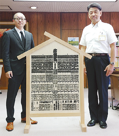 10年ぶりに小田原市で開催された大相撲地方巡業・小田原場所の「板番付」が9月11日、勧進元の一般社団法人小田原城下町・杉崎尚人理事長から小田原市に贈呈された。