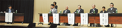 小田原と南足柄市の「合併について考えるシンポジウム」が9月24日、市民会館で開かれた。加藤憲一市長と自治会、社協、PTAの委員のパネルディスカッション=写真=では合併のメリット・デメリットへの意見が述べられた。