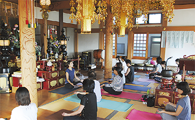 9月26日の昼下がり、開け放たれた扉から初秋の心地よい風が吹き抜ける蓮華寺(千代)の本堂。ツクツクボウシの鳴き声が響き、線香の香りがかすかに漂う空間で市民らがヨガを楽しんだ。